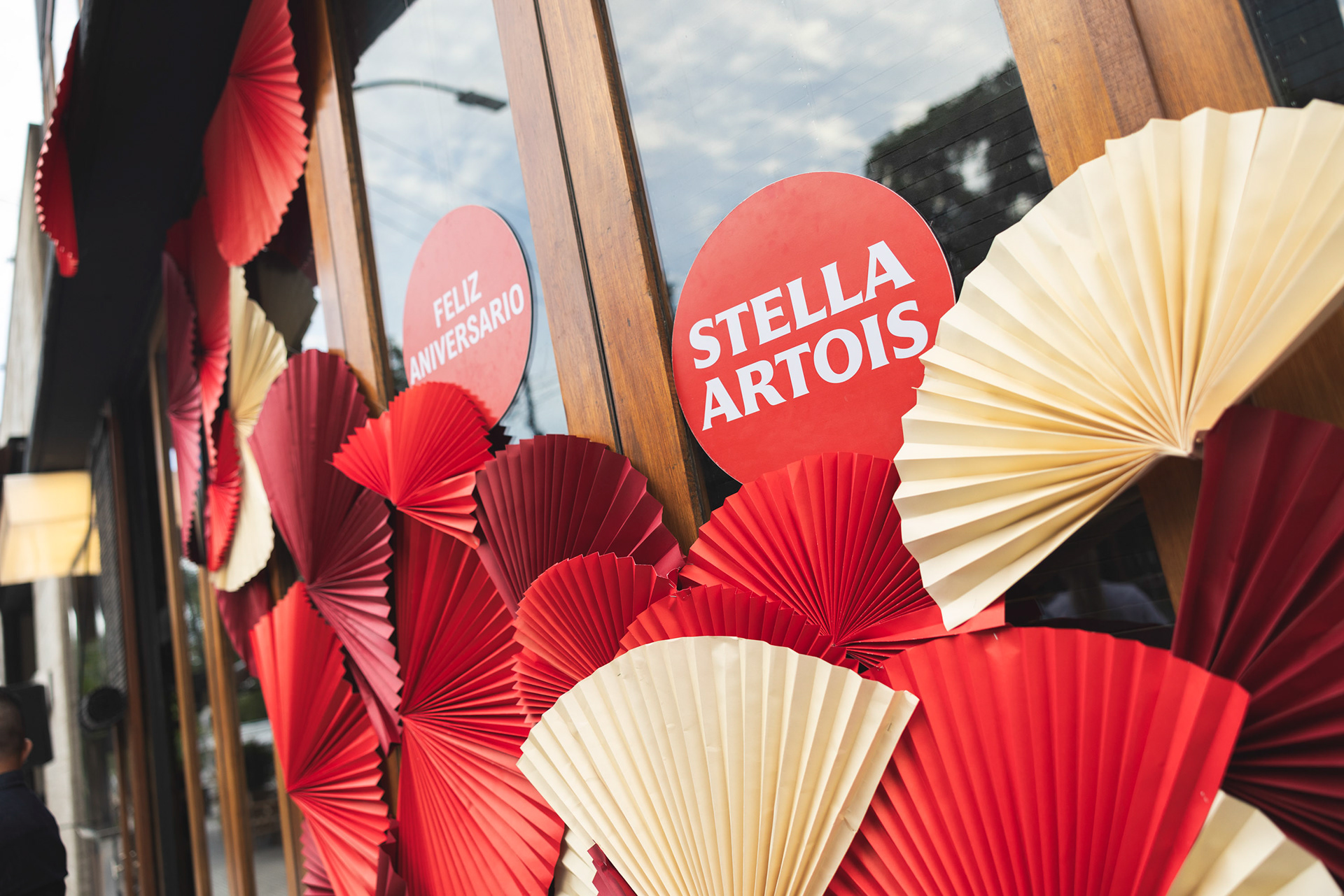 Para marcar este hito, se realizó una intervención impactante en la fachada, diseñada para atraer la atención tanto de transeúntes como de invitados. La ambientación trasladó el espíritu de la cocina japonesa del restaurante al espacio exterior, con abanicos en degradé de tonos rojos, evocando la elegancia y tradición de la cultura japonesa.